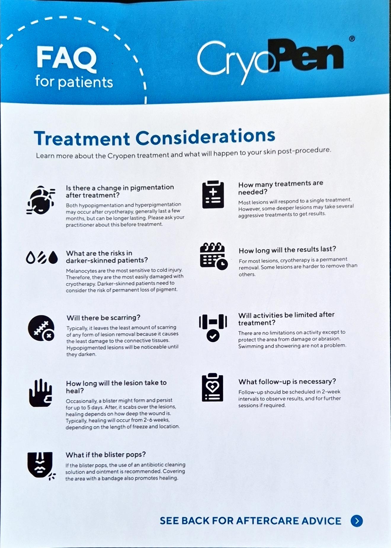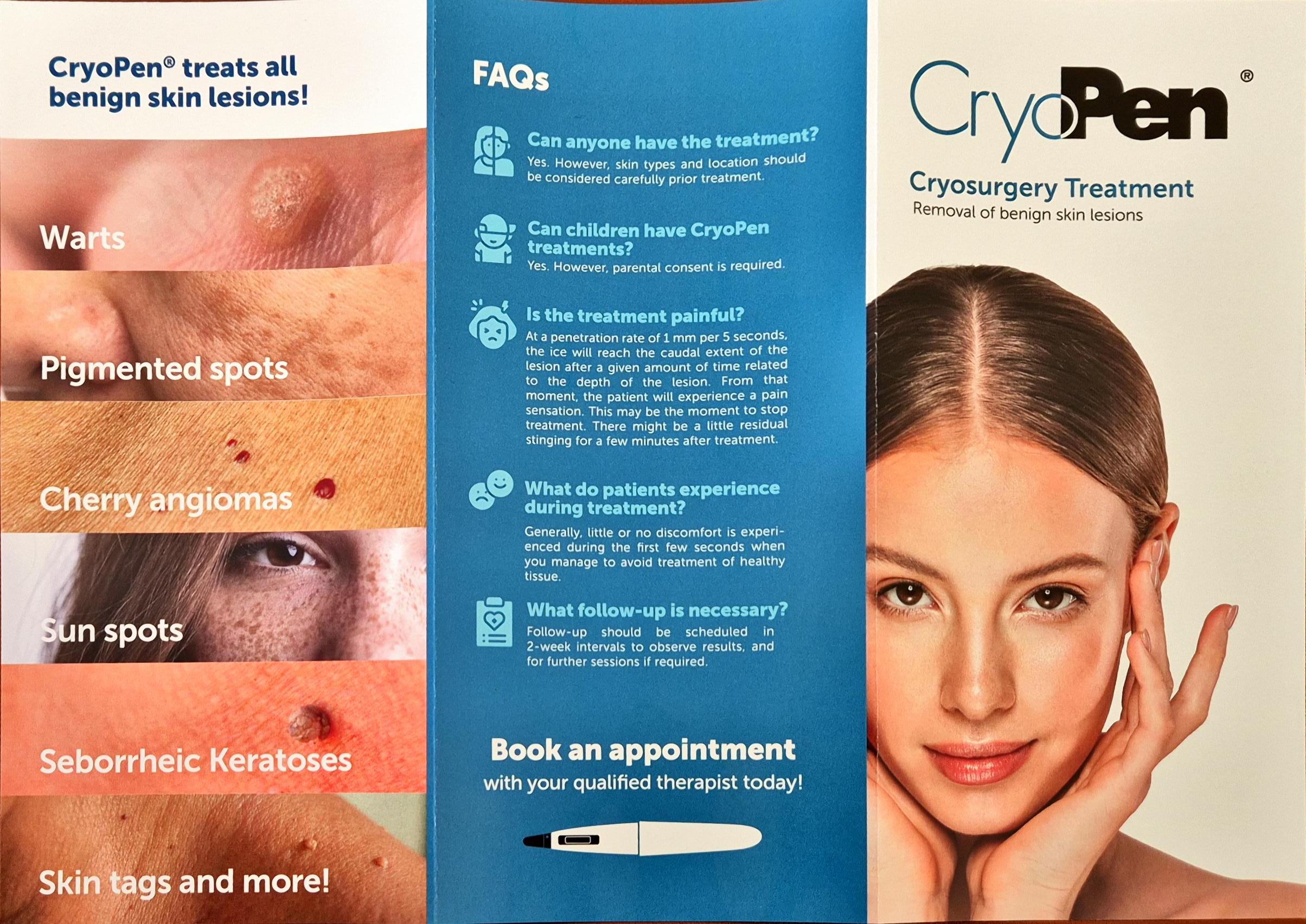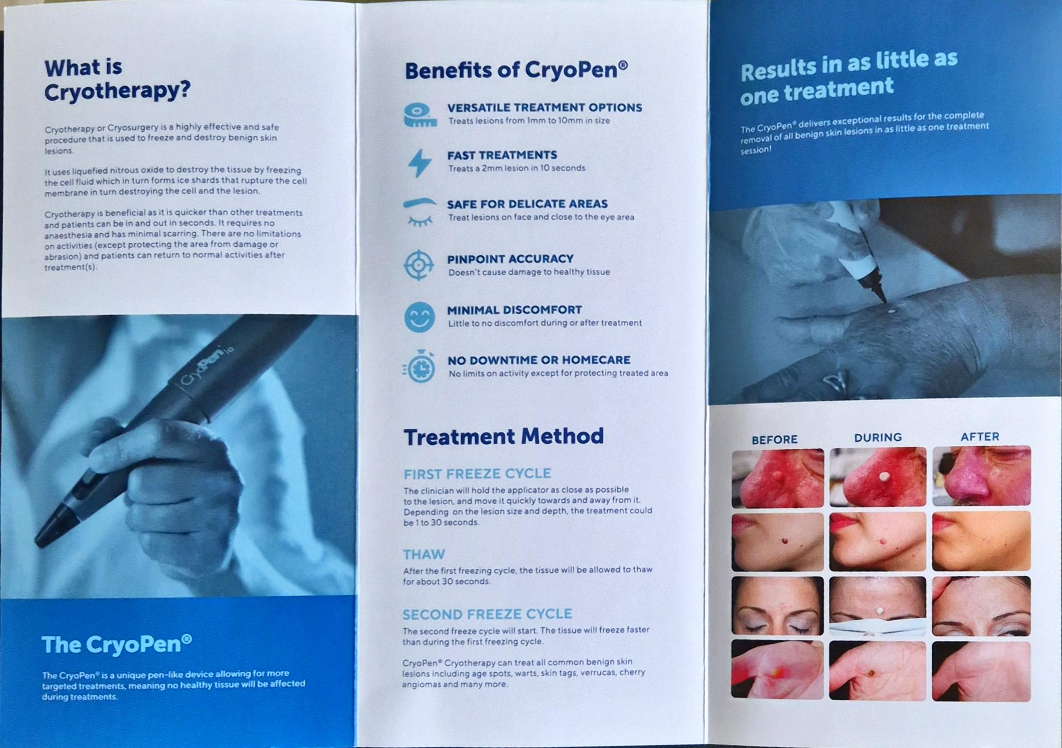 As part of the Cryo-therapy treatment, Angie is trained in MASCED (Melanoma and Skin Cancer Early Detection). A Cyro-pen is used to non-surgically remove benign skin lesions as listed below.